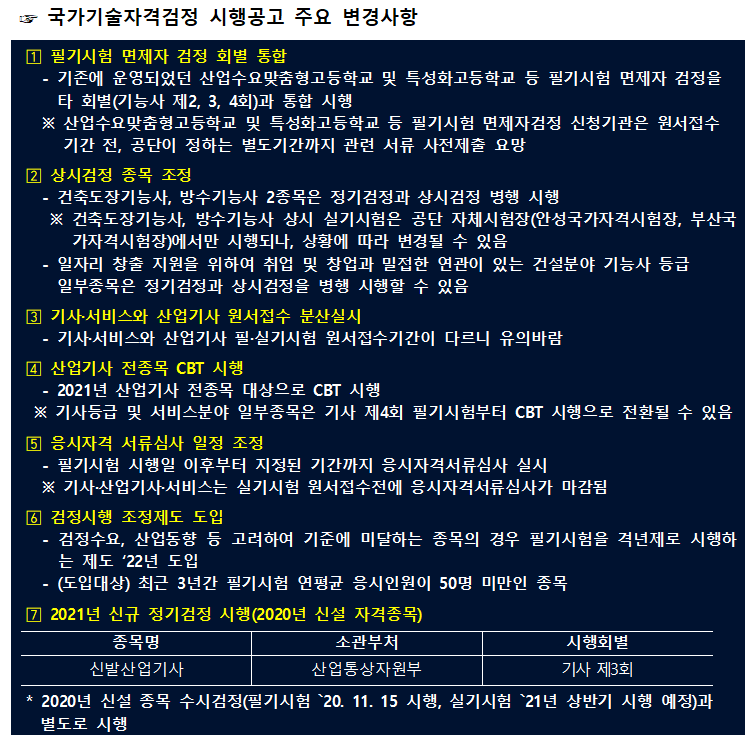 그 외에 서류 심사 일정 조정, 연평균 응시 인원 50명 미만인 종목에 대해서 격년제로 시행할 수 있도록 하는 제도가 만들어졌습니다. 2022년 부터 시행된다고 합니다.