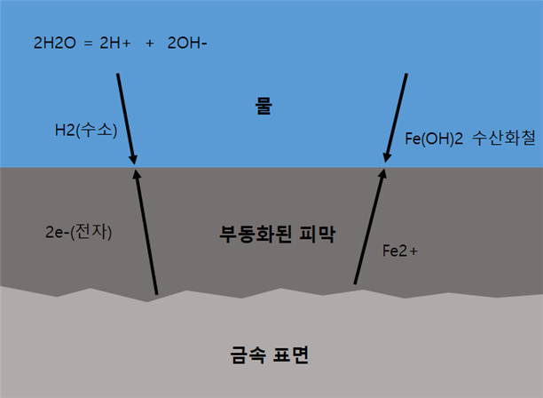 또한 미리 재료의 표면에 Fe3O4 피막이 생성되어 있어도 표면의 Fe가 Fe2+와 2e로 전리되어서 Fe3O4 피막과 물의 경계에 도달하게 되고, Fe2+는 수중의 OH-와 결합하여 Fe(OH)2로 되기도 한다. 또한 그 일부는 다시 산화하거나 분해해서 Fe3O4를 생성하기도 한다.