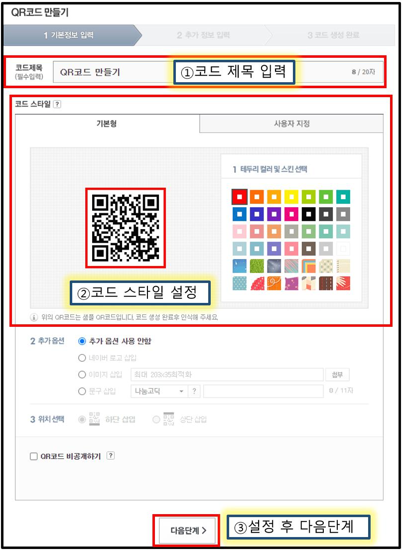 필요에 따라 QR코드를 만들려는 경우 스타일을 변경할 수 있고, 필요에 따라 네이버 로고나 이미지를 삽입하여 제작할 수 있습니다.