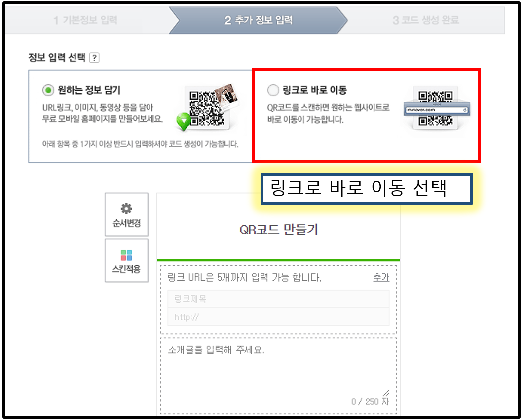 다음 단계는 추가 정보를 입력하는 사항인데요. QR코드를 만들기 위해 링크나 이미지, 동영상 등을 삽입할 수 있습니다.