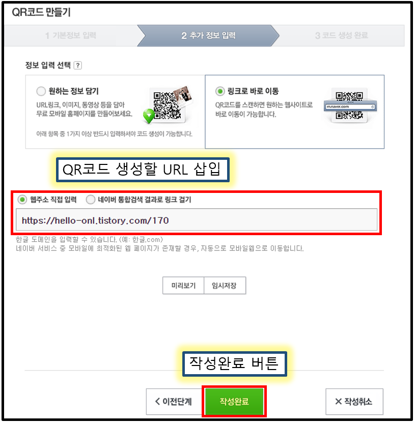저의 경우 https://hello-onl.tistory.com/170의 내용으로 만들어 보고자 해서 만들어 보았습니다. 해당 내용을 작성 후 작업 완료 버튼을 만들면 본인의 URL 주소를 얻을 수 있습니다.
