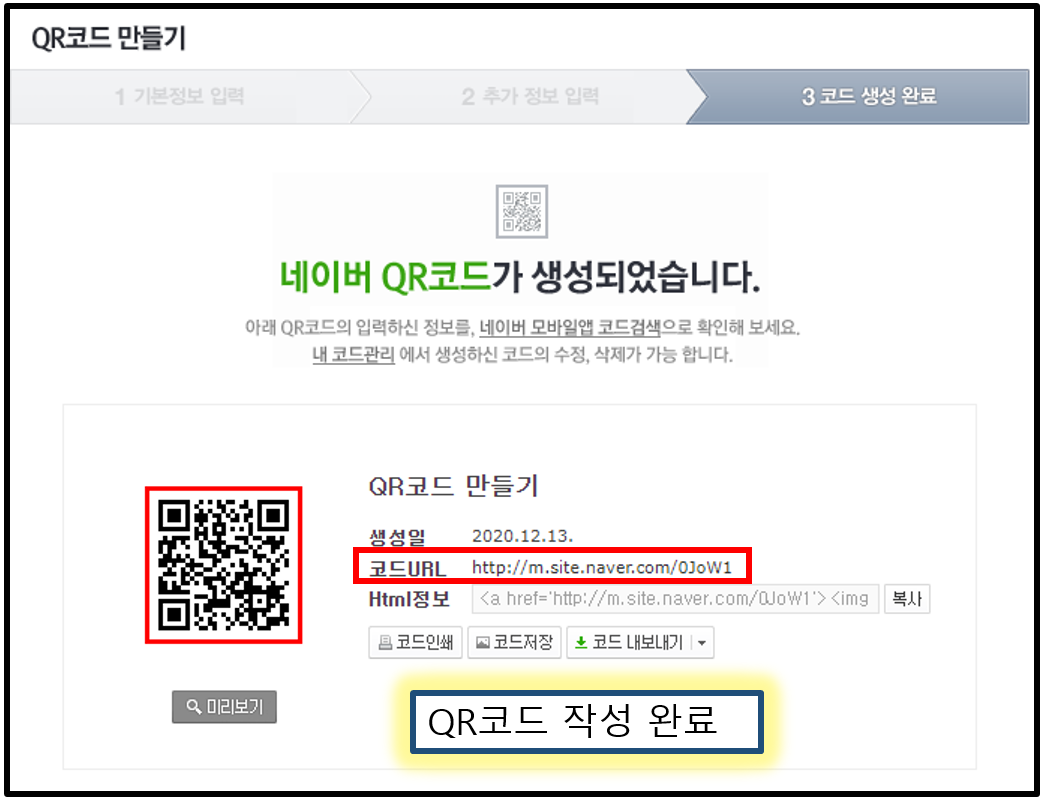 네이버 QR코드가 생성되었습니다.라고 뜨는 경우 생성이 완료됨을 확인할 수 있습니다. 아래 코드 이름이 작성되어 있고, 코드 URL이라고 보면 http://m.site.naver.com/0JoW1라고 작성이 되어 있는데요.