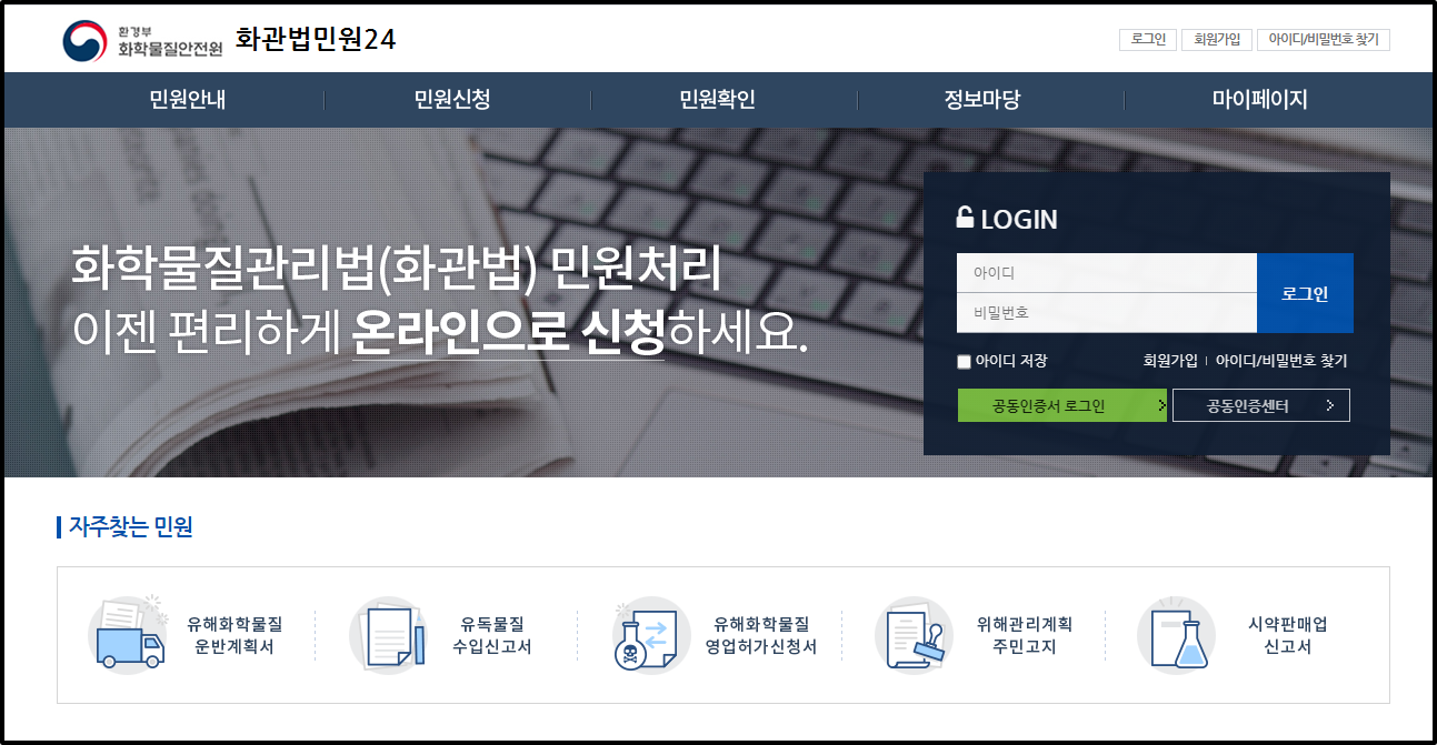 화관법 민원 24의 경우 화학물질 종합정보시스템과 다르게 민원 업무를 수행하다 보니 로그인 절차가 꼭 필요합니다.