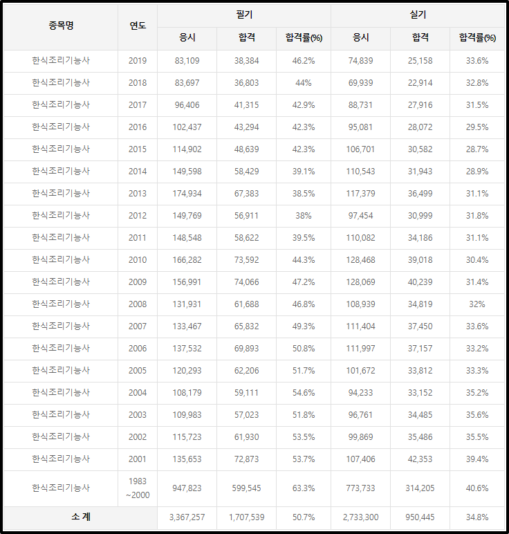 한식조리기능사가 만들어진 1983년부터 현재까지 330만 명이 넘는 인원이 필기시험에 응시를 했고, 그중 95만 명이 자격증을 취득했습니다. 이 정도면 지인 중 한 두 명쯤은 자격증을 가지고 있는 분들도 많을 것 같습니다.