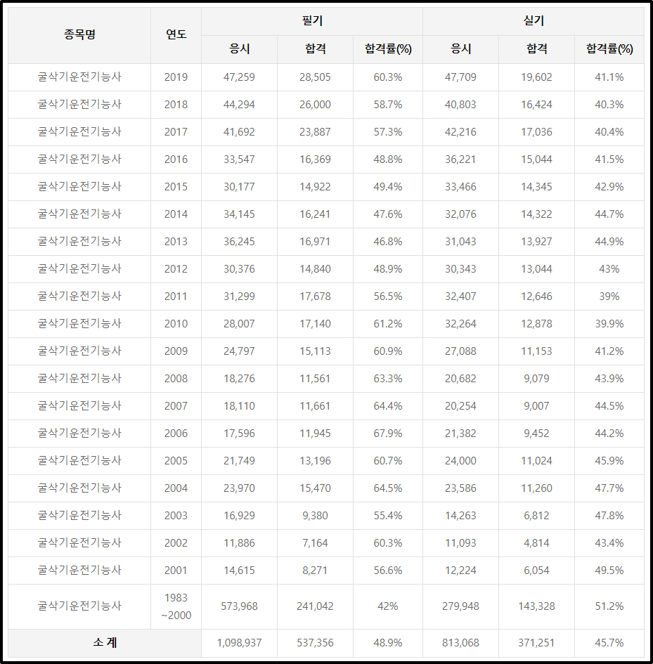 1983년 기능사 자격이 만들어진 후 약 110만 명이 응시하여 37만여 명이 자격증을 취득했습니다. 필기시험의 평균 합격률은 약 48.9%, 실기시험의 경우 약 45.7%로 합격률은 양호한 편입니다.