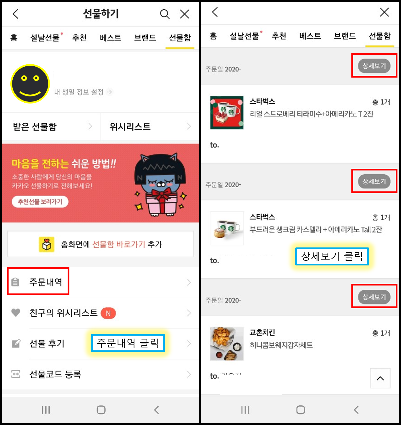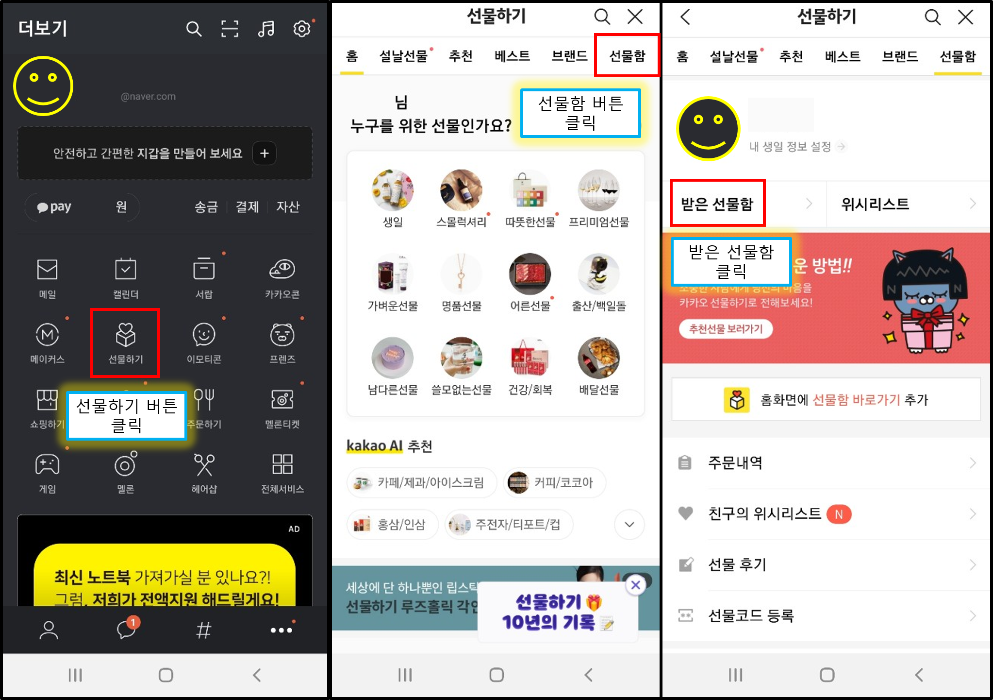 선물을 확인하는 방법은 카카오톡 선물함에서 확인할 수 있습니다.