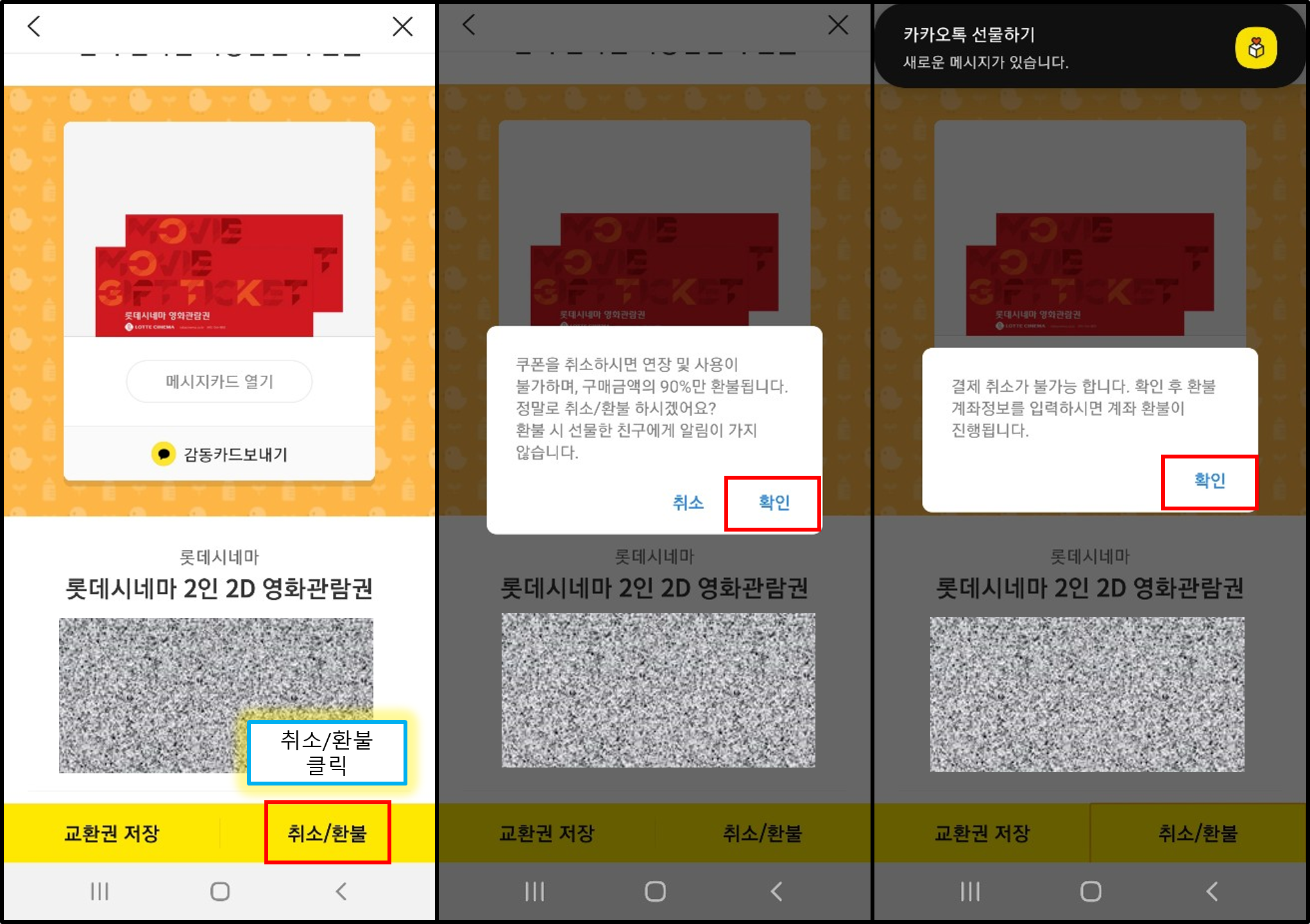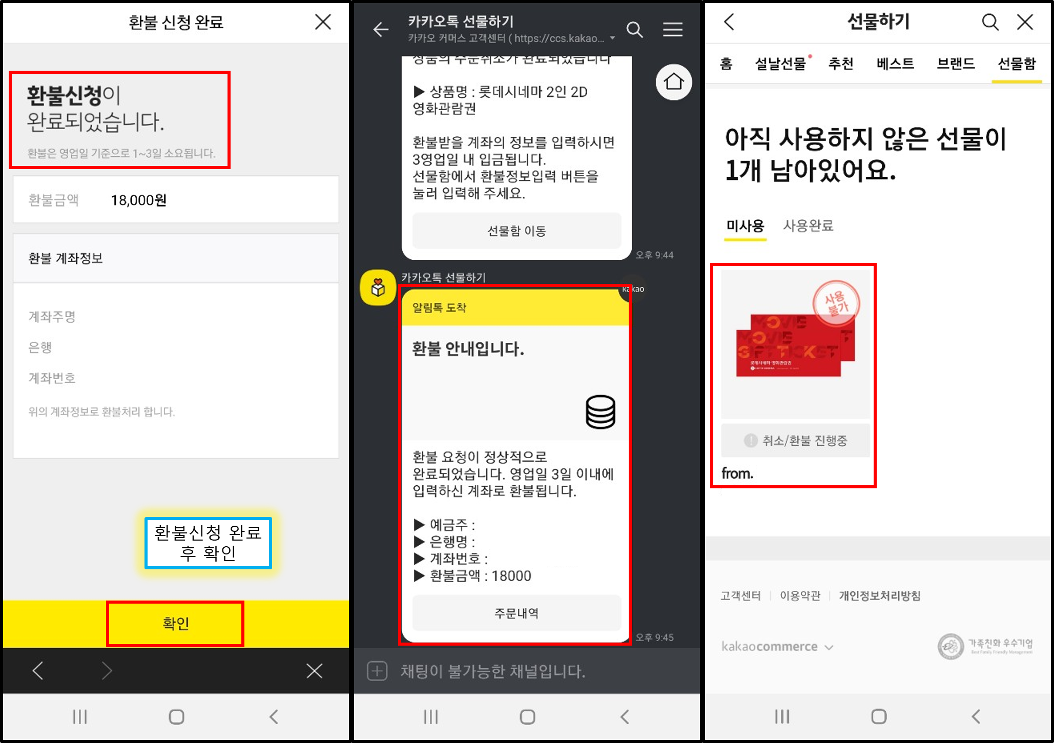 확인 버튼을 누르면 환불 신청이 완료되었다는 내용이 뜨고, 카카오톡 선물하기에서는 알림 톡이 도착하게 되네요.
