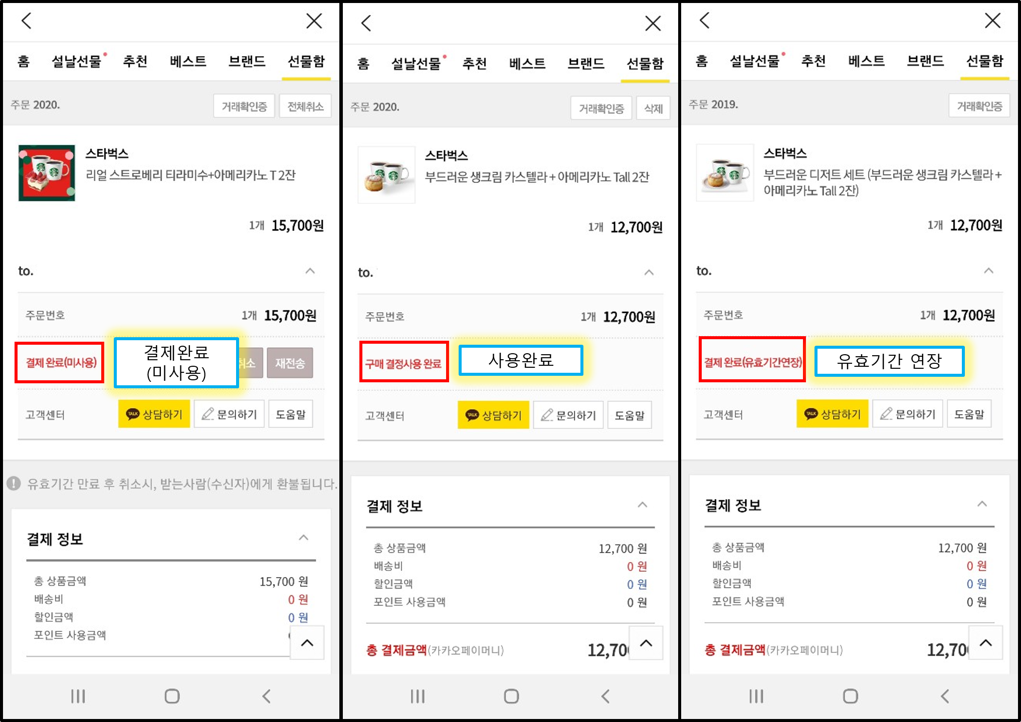 카카오톡으로 보낸 선물을 환불한다고 그 내용이 선물을 보낸 상대방에게 알림으로 가지는 않습니다. 하지만 보낸 선물을 사용했는지, 연장했는지 또는 환불했는지까지 확인이 가능한데요.