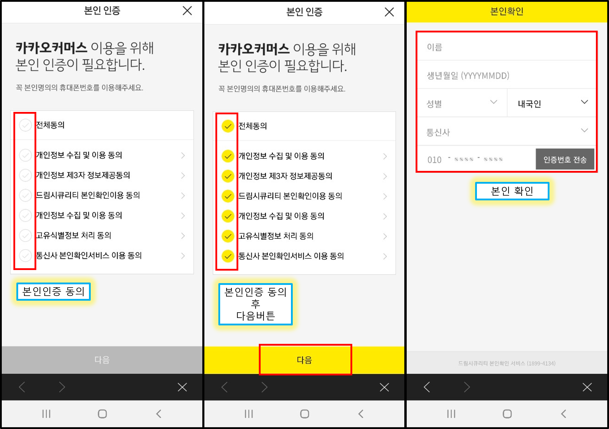 환불을 위한 계좌 작성 시 필요한 사항으로 본인인증을 하게 되는데요. 카카오커머스를 이용해 환불이 진행되다 보니 이에 대한 개인정보 등 이용 동의를 해야 합니다.
