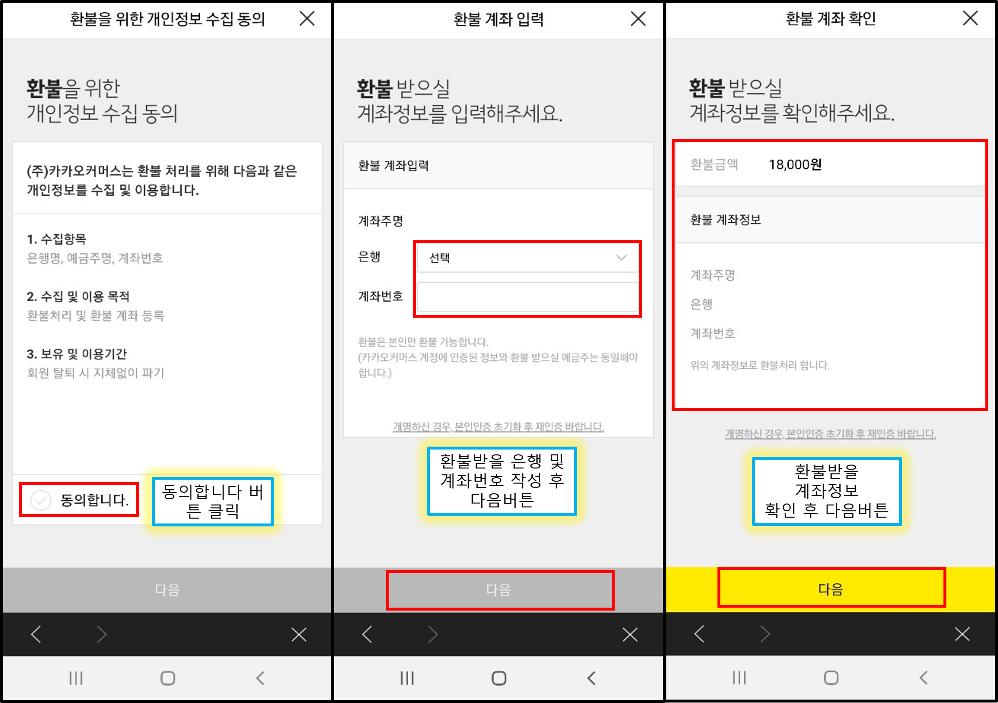 개인 정보 수집에 대한 동의를 하고, 환불 받을 계좌 정보를 기입합니다. 은행과 계좌번호를 확인하고 다음 버튼을 누르면 환불금액과 계좌정보를 확인하도록 하는 란이 나타납니다.