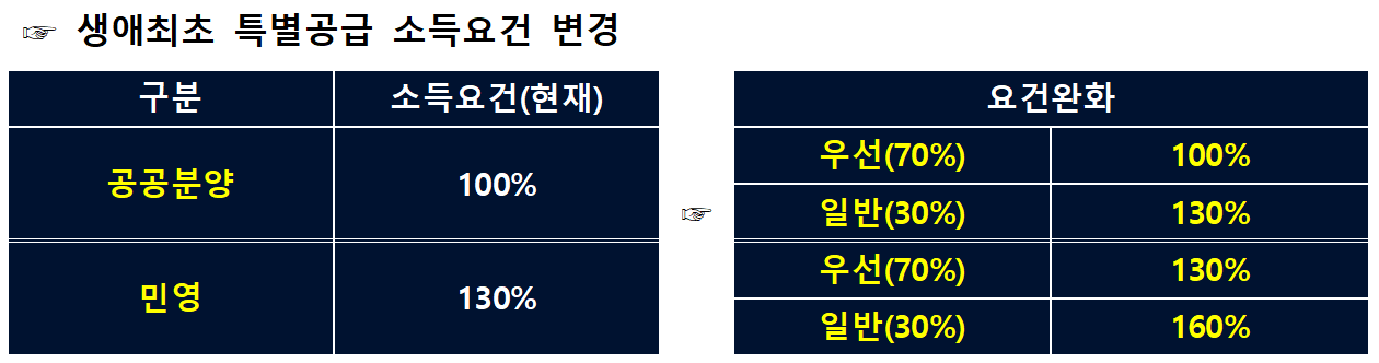 2021년부터 생에 최초 특별공급의 소득기준이 완화되었습니다. 기존 공공주택의 특별공급 소득기준은 도시근로자 월평균 소득의 100% 이하, 민영주택의 경우 도시근로자 월평균 소득의 130% 이하였습니다.