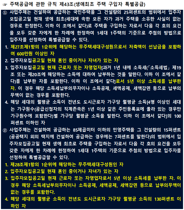 주택공급에 관한 규칙에 따라 생애최초 주택 구입자 특별공급에 대한 사항은 위와 같습니다. 다시 법에 따라 제27조 제1항의 1순위에 해당하는 무주택 세대 구성원으로 선납금 600만원 이상을 말하고 있습니다.