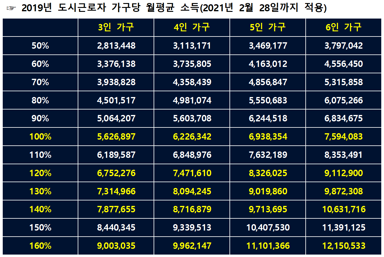 6인 가구 소득기준(2021년 2월 28일까지 적용)
