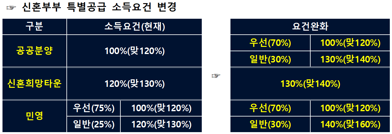 신혼부부 특별공급의 경우 2020년까지 도시근로자 월평균 소득의 외벌이 120%, 맞벌이 130%이하였습니다. 하지만 2021년부터 도시근로자 월평균 소득의 외벌이 기준 140%, 맞벌이 160% 이하로 요건이 완화되었습니다.