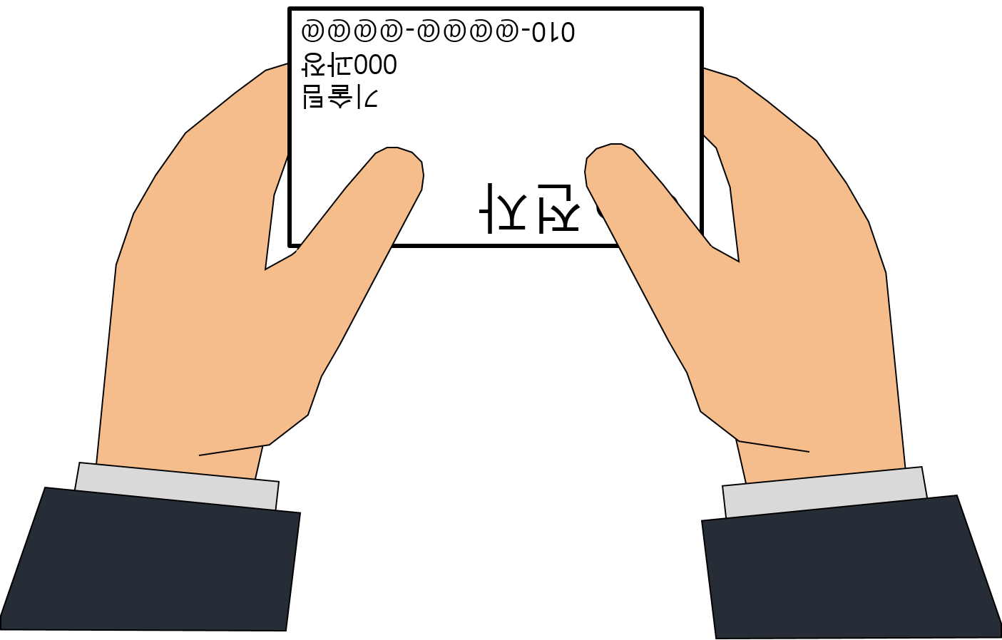 다른 한 손으로 받기 위해 한 손으로 명함을 건네주는 경우가 있는데 예의에 어긋나는 행동입니다.