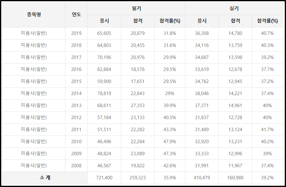 미용사 일반의 경우 2008년 이후 전체 필기 합격률은 35.9%, 실기 합격률이 39.2%로 필기와 실기 시험의 합격률이 비슷합니다.