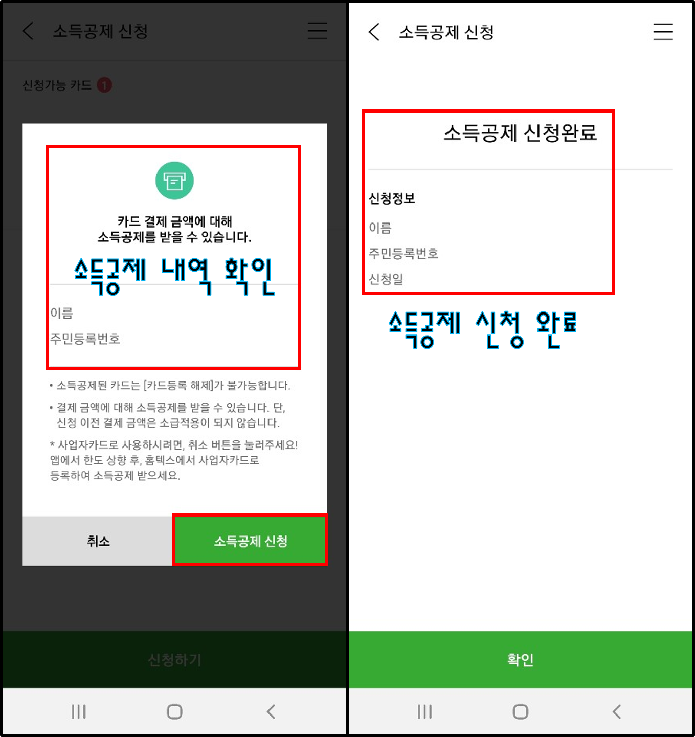 개인 정보 수집 및 이용 동의 후 소득공제 신청 카드를 선택하고 신청하면 신청할 수 있습니다.