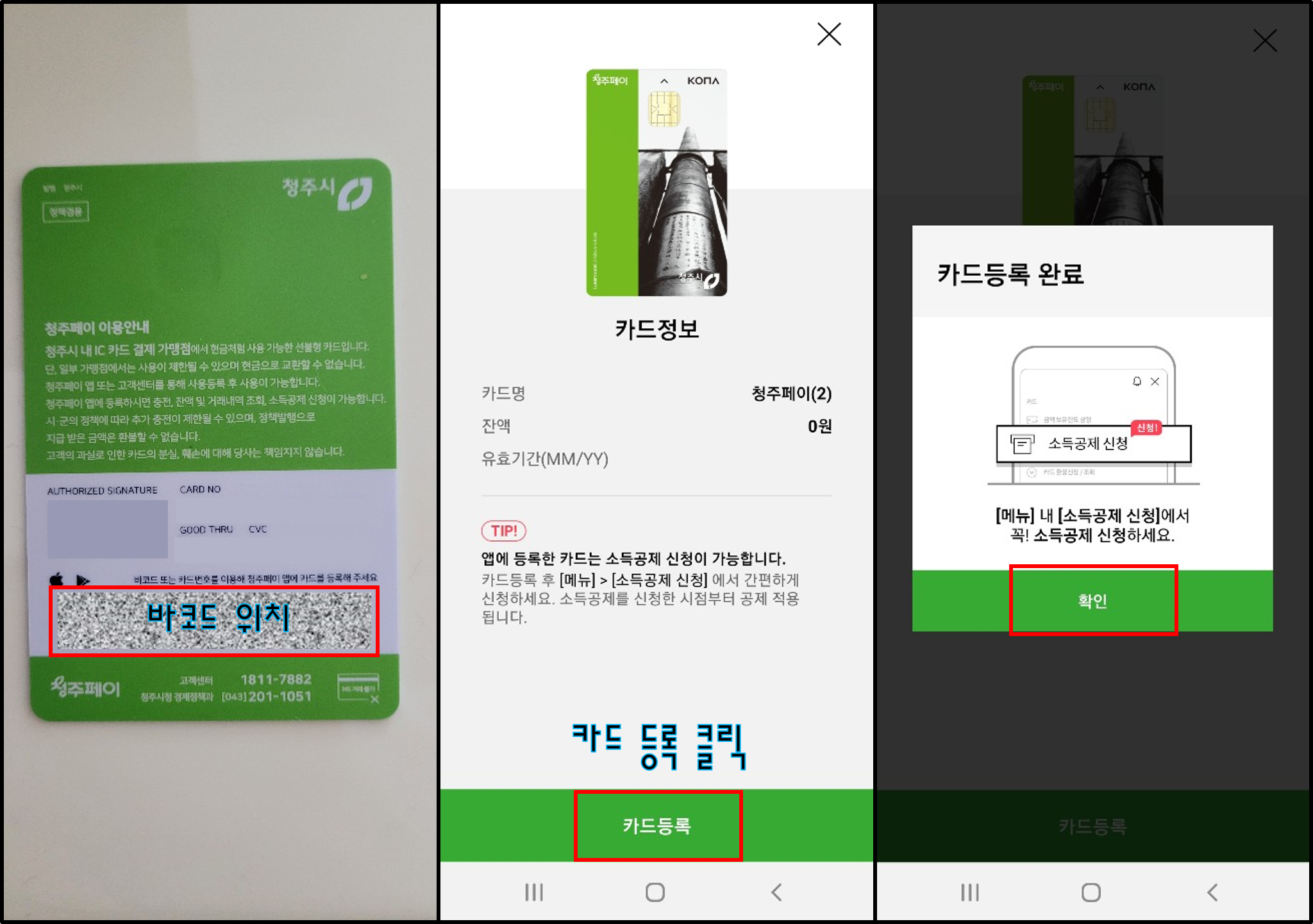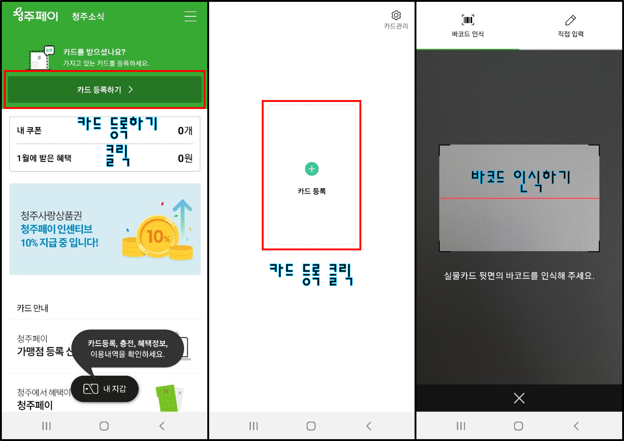 저는 청주 페이를 미리 신청해 놓았고, 이제야 카드를 받을 수 있었습니다. 카드 수령 후 카드 등록방법은 다음과 같습니다.