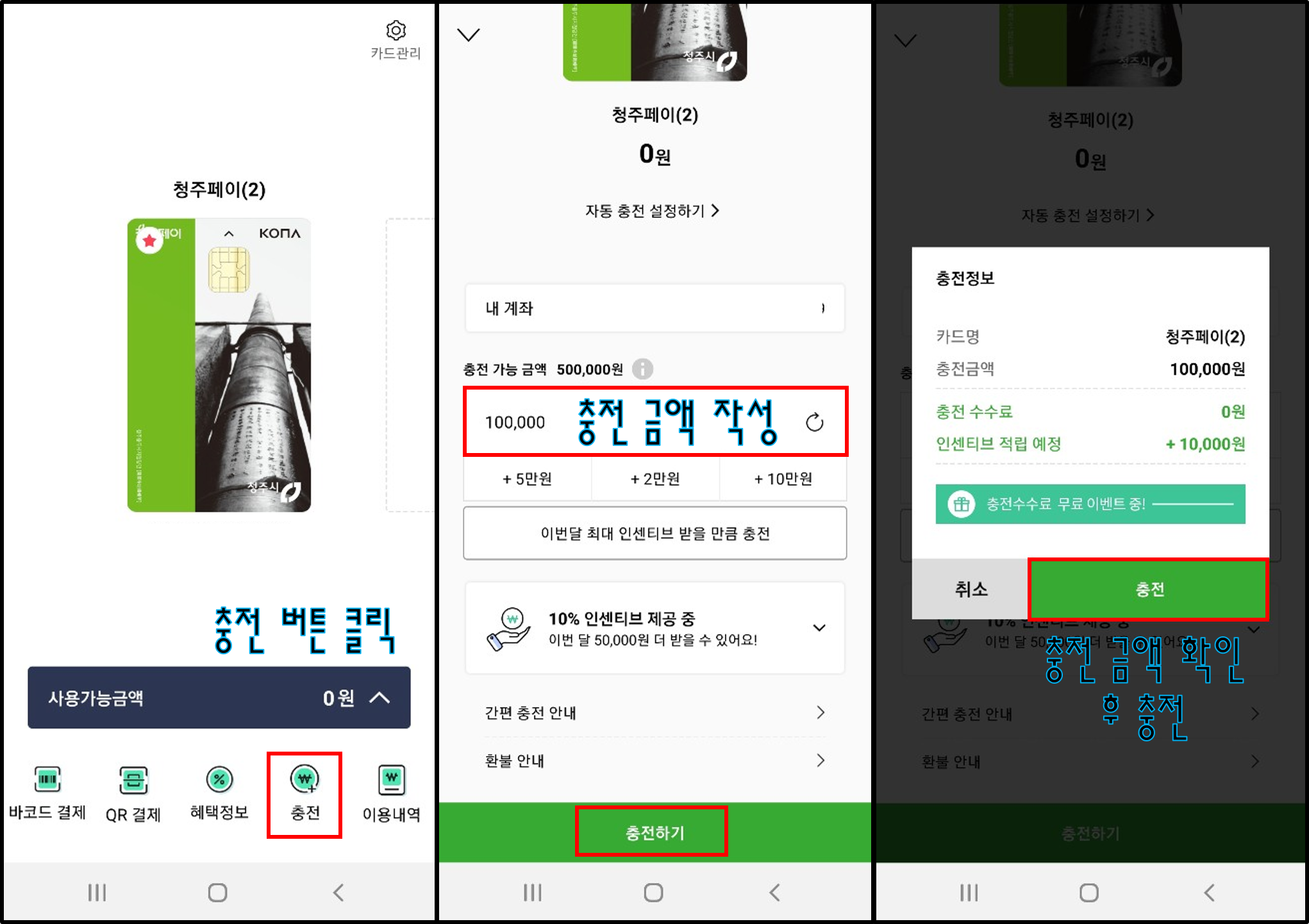 저는 우선 10만 원을 먼저 충전해 보았는데요. 충전 금액을 누르고 충전하기 버튼을 누르면 충전 정보가 나옵니다. 충전 정보에는 충전 금액 10만 원과 인센티브 적립 1만 원이 되어 있고, 확인 후 충전 버튼을 누릅니다.