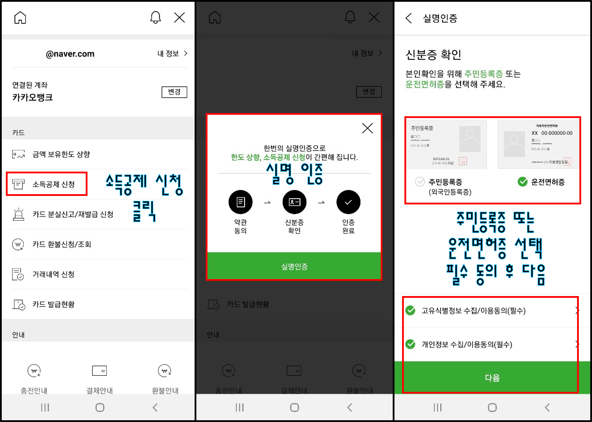 그중 소득공제를 받아야 하기 때문에 소득공제 버튼을 누르면, 실명확인이 필요하다고 나옵니다. 실명확인은 주민등록증 또는 운전면허증으로 먼저 신분증 확인을 해야 하는데요.