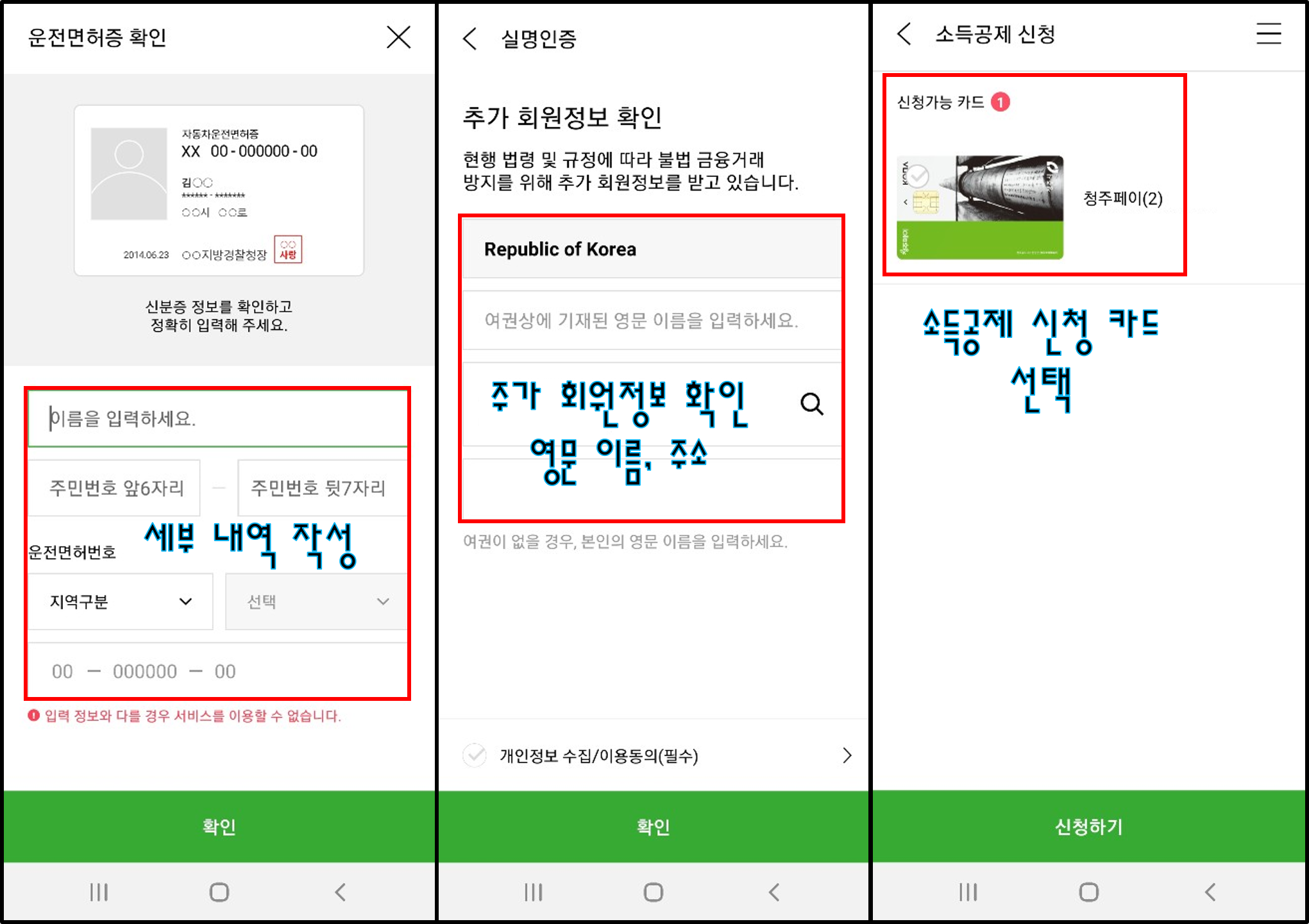 저는 운전면허증으로 확인했습니다. 운전면허 확인으로 이름, 주민번호 및 운전면허 번호를 다 작성 후 확인하면 됩니다. 작성 후 추가 회원 정보로 여권상 기재된 영문 이름, 주소 등을 확인하면 되는데요.