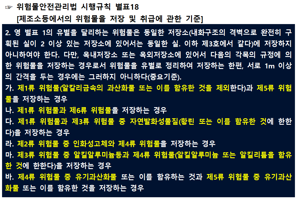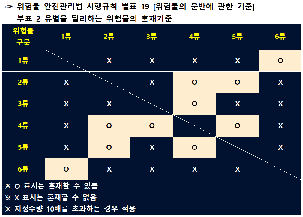 각각의 위험물은 서로 혼재되는 경우 갑작스러운 반응으로 인한 화재나 폭발, 혹은 인체에 유해한 독성가스를 발생하는 등 위험한 요소가 있습니다. 따라서 법에서는 류별로 위험물을 혼재할 수 있는 기준을 만들어 놓았습니다.