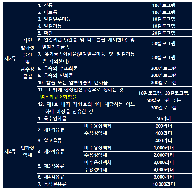 3류 위험물 자연발화성 물질 및 금수성물질의 경우 칼나알알(10kg), 황(20kg), 알유(50kg), 금금칼(300kg)로 나뉩니다. 여기에 별도로 행정안전부령으로 정하는 기준으로 2021년 현재 염소화규소화합물이 추가되어 있습니다. 아래 버튼을 누르면 각 위험물별 자세한 설명을 확인할 수 있습니다.