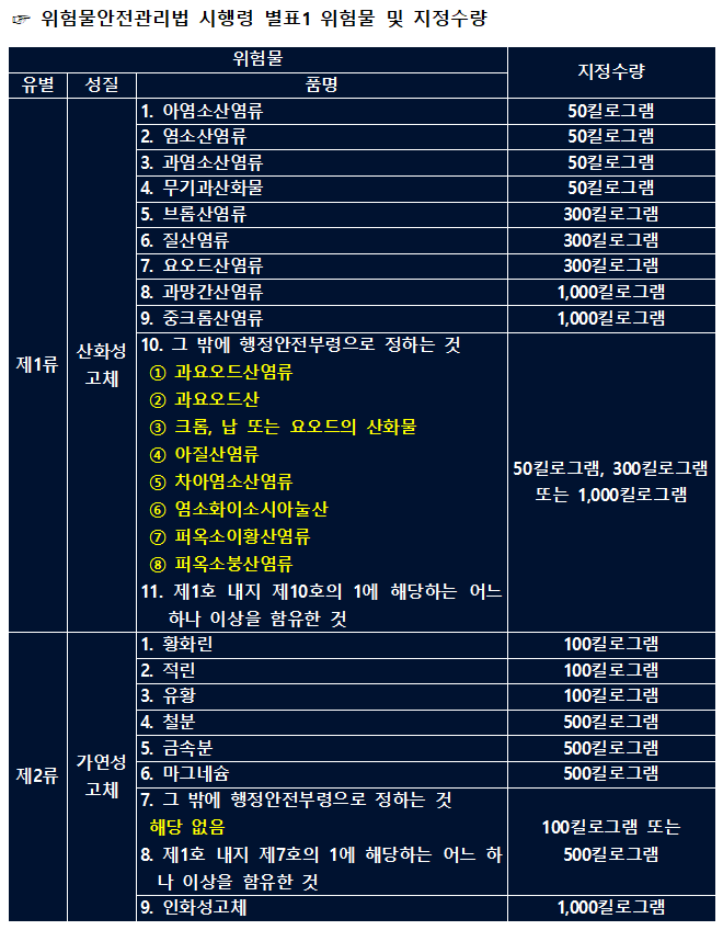 아래 작성되는 내용은 위험물 안전관리법과 관련된 가장 기본적으로 이해해야 할 1류 위험물부터 6류 위험물까지의 내용이며, 위험물 안전관리법 시행령 별표 1에서 정하는 위험물과 지정수량 외에 행정안전부령으로 정하는 추가 위험물에 대한 자료도 현재 기준으로 포함시켜 놓았으니 도움이 되었으면 좋겠습니다.