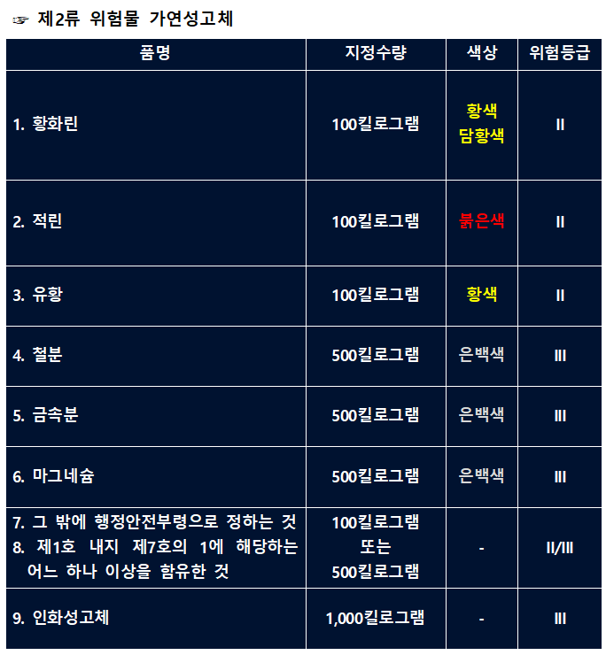 황화린, 적린, 유황 및 철분은 고체로서 화염에 의한 발화의 위험성 또는 인화의 위험성을 판단하기 위하여 고시로 정하는 시험에서 고시로 정하는 성질과 상태를 충족하는 것으로 본다고 하니 이 또한 알아두는 게 좋겠습니다.