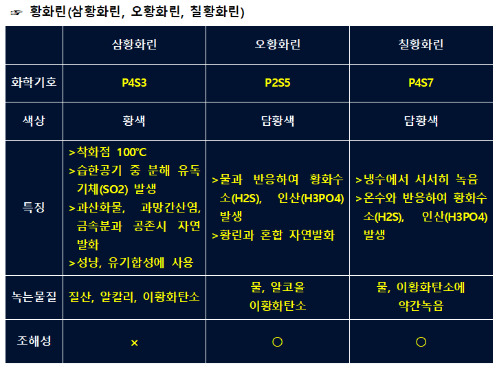 황(S)과 인(P)의 화합물이나 어떻게 조합되었는지에 따라 물성이 달라 문제에 굉장히 자주 나옵니다. 헷갈리긴 하지만 자격증을 취득하기 위해 꼭 짚고 넘어가야 하며 암기도 함께 진행해야 합니다.
