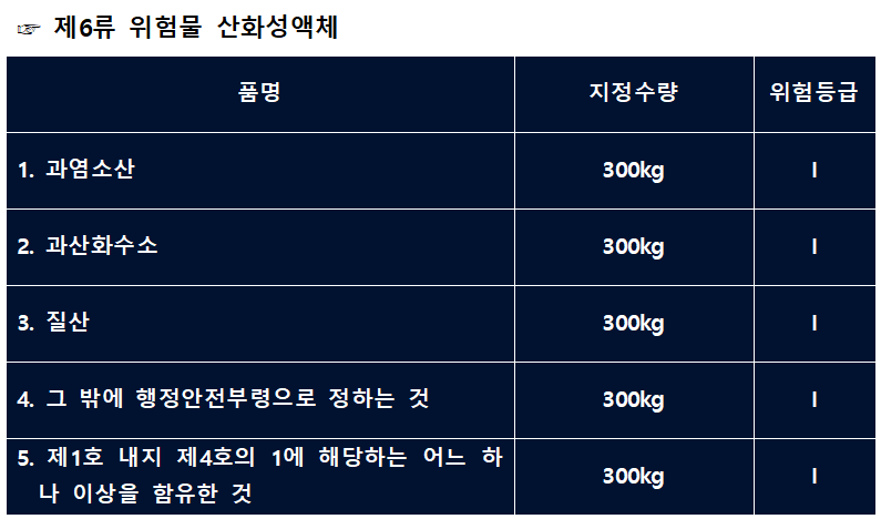 위험물 안전관리법에 따라 제6류 위험물인 산화성 액체는 모두 300kg으로 지정수량이 정해져 있습니다. 6류 위험물의 경우 모든 물질의 지정수량과 위험등급이 동일하기 때문에 다른 류의 위험물을 외우는 것보다 쉽게 암기할 수 있습니다.