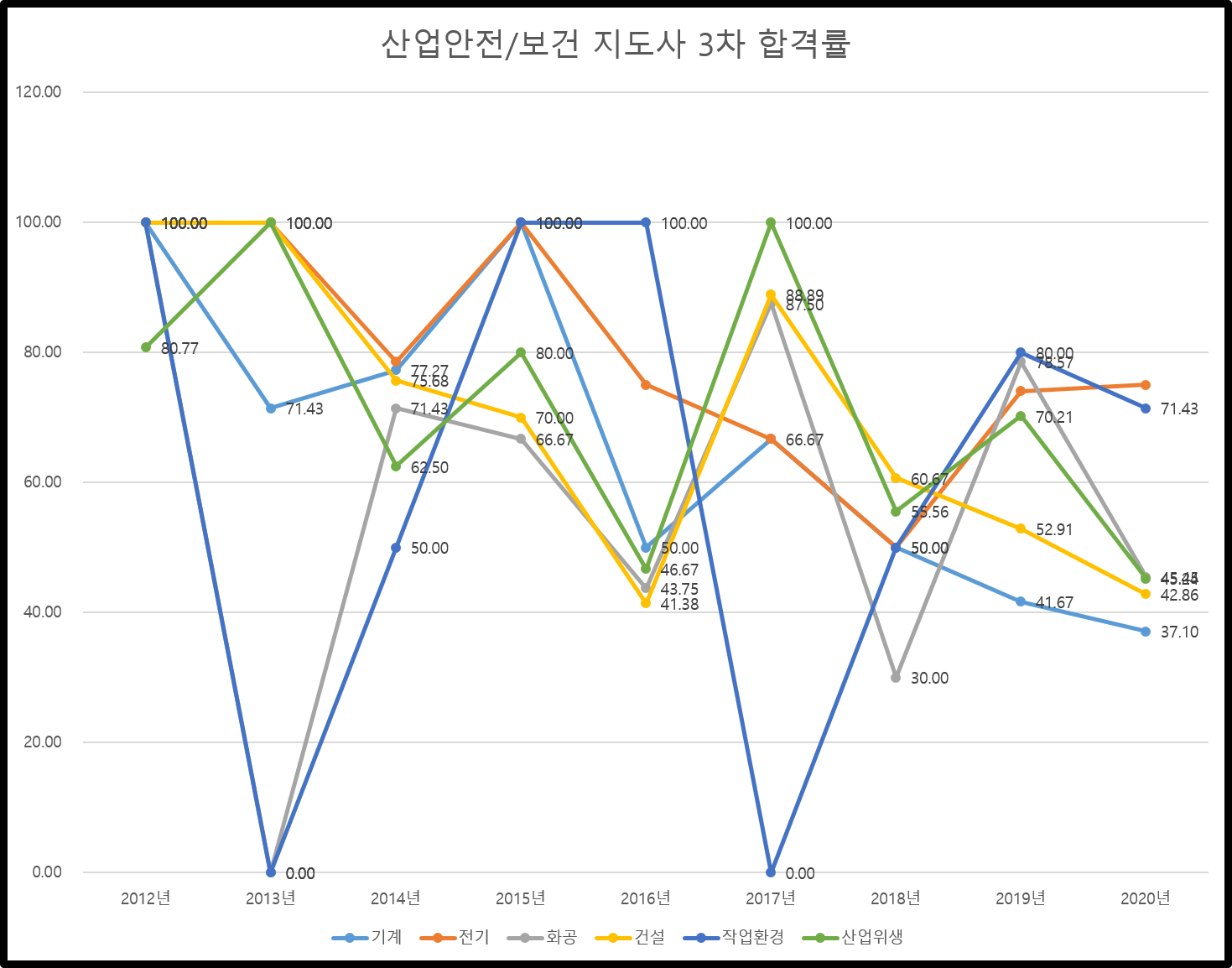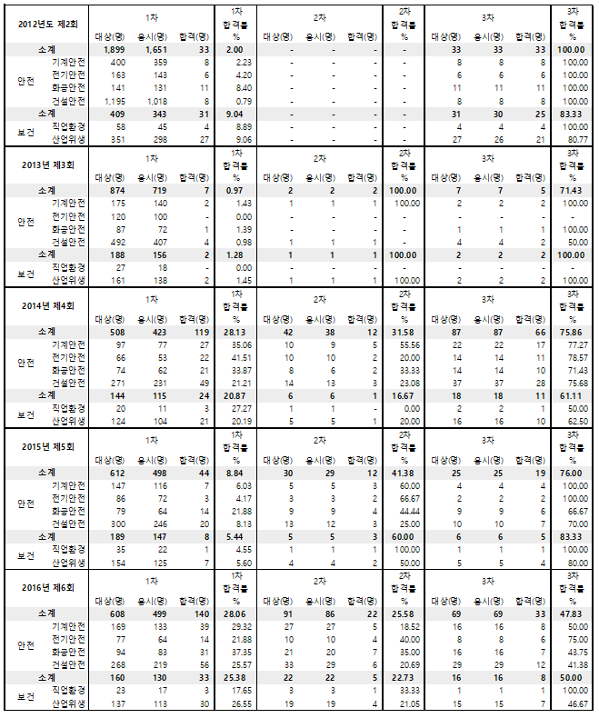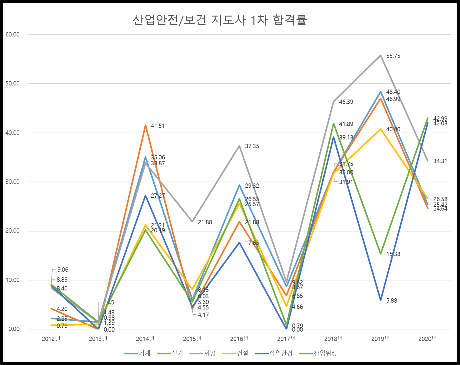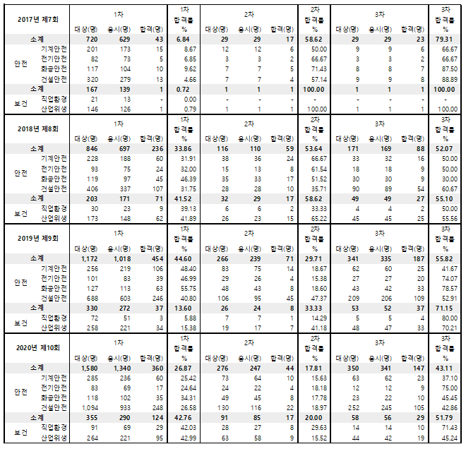 1차 시험의 경우 1,2,3과목의 난이도에 따라 비슷한 곡선이 만들어지는 것을 확인할 수 있습니다. 해당 회차의 난이도에 따라 합격률의 변동이 심한 편입니다. 지인의 이야기를 들어보면 3과목인 기업진단 및 지도 과목의 난이도에 합격률의 대부분이 달려있는 게 1차 시험이라고 합니다. 안전 보건과 관련된 업무를 수행하는 분들도 어려워하는 것을 보면 그만큼 난이도가 어려운 시험인 것 같습니다.