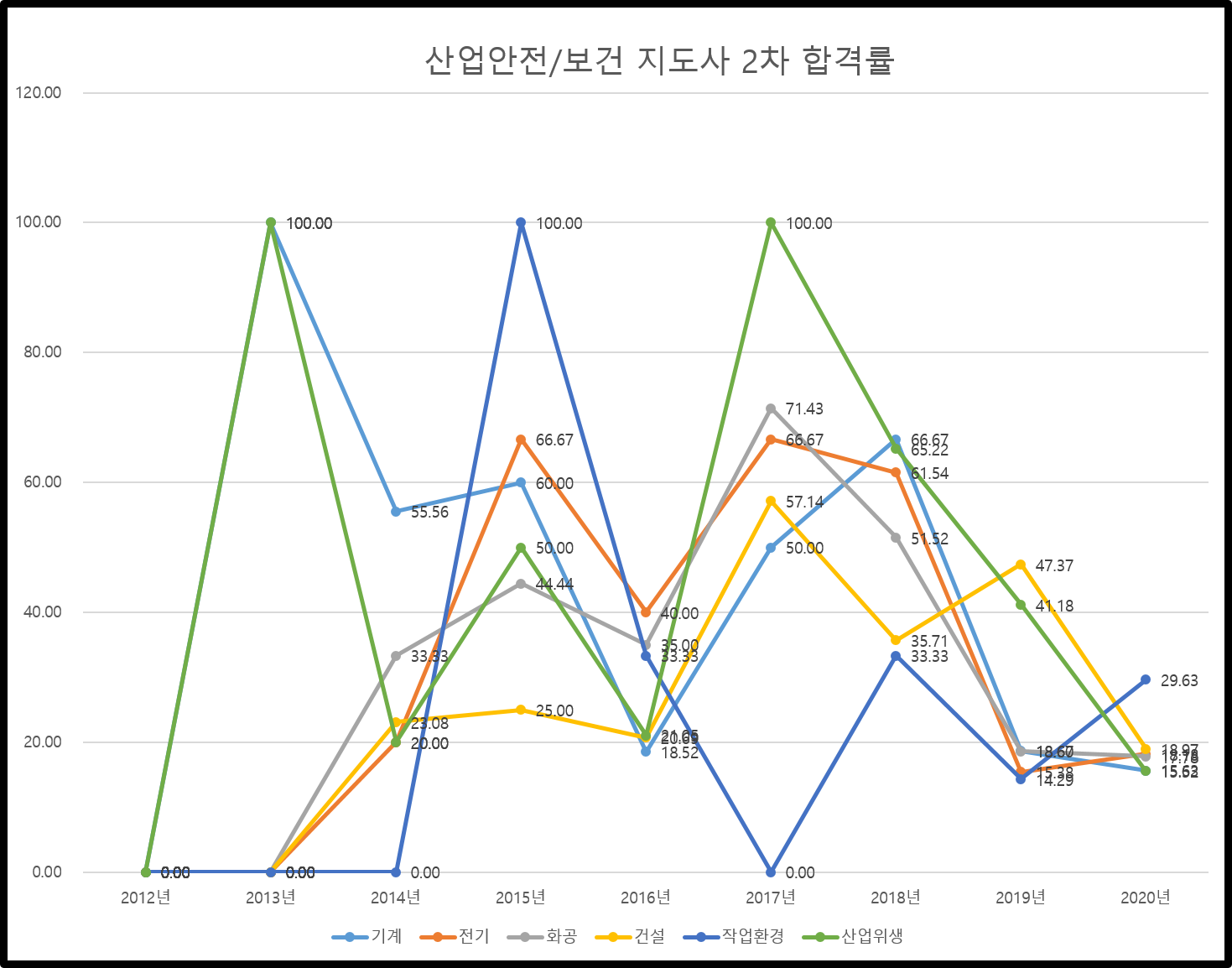 역대 산업안전지도사 화공분야 합격률은 2017년 71%, 2018년 51%를 제외하고 모든 시험이 50%가 안 되는 시험인데요. 특히 2020년도와 2019년도는 합격률이 20%도 채 되지 않은 상당히 어려운 난이도로 출제되었습니다.