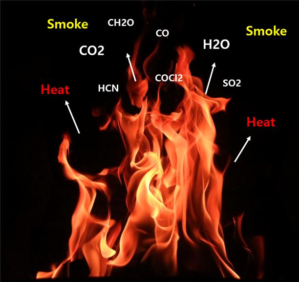 물질이 연소할 때 화학변화에 의해 처음 물질과는 다른 연소 생성물이 생성되며, 이러한 연소 생성물에는 연소가스, 열, 연기, 불꽃 등이 있다.
