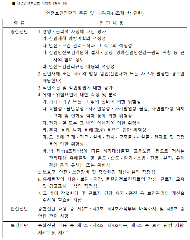 법에서 정하는 안전보건진단의 종류 및 내용은 산업안전보건법 시행령 별표 14(안전보건진단의 종류 및 내용)에서 정하고 있으며 해당 내용은 다음과 같습니다.