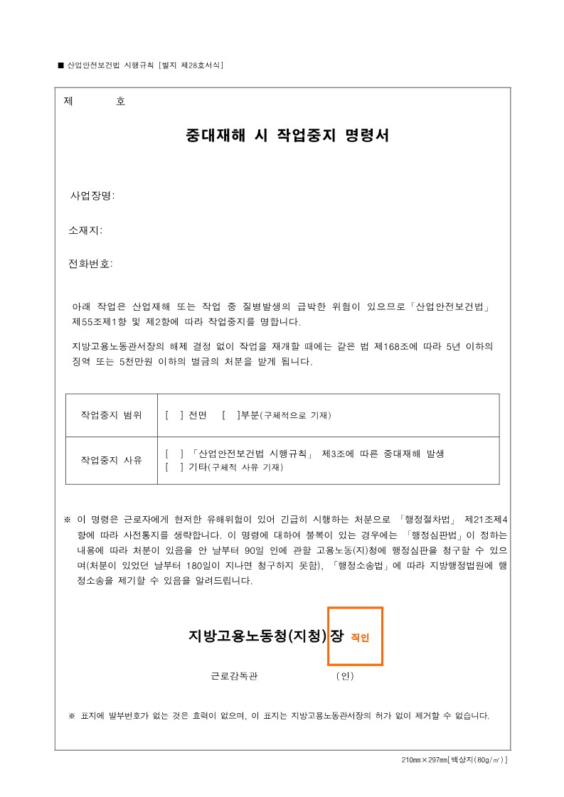 또한 토사 구축물의 붕괴나 화재, 폭발 및 유해하거나 위험한 물질의 누출 등으로 인해 중대재해가 발생하여 그 재해가 주변으로 확산될 수 있는 경우 해당 사업장의 작업을 중지시킬 수도 있습니다.