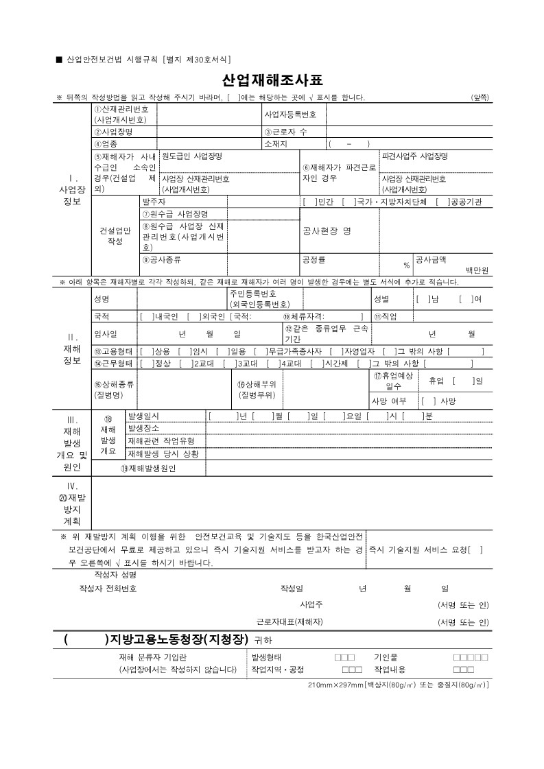 산업재해가 발생한 경우 위 양식의 산업재해 조사표를 작성해야 합니다. 단 사고가 났다고 하더라도 모든 사고가 대상이 되지는 않는데요.