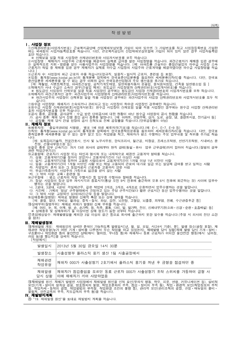 | 재해 조사 | 1. 6하 원칙에 의한 사상자 보고 2. 잠재 재해원인 확인 |