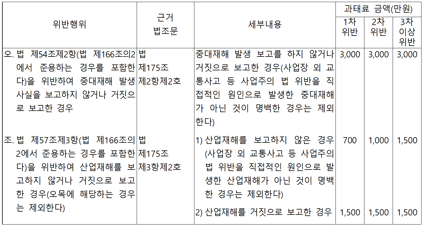 중대재해의 보고를 하지 않거나 거짓으로 보고한 경우 3000만 원의 과태료 대상이 되며, 산업재해의 경우 보고하지 않은 경우 1차 위반에 700만 원, 2차 위반에 1000만 원, 3차 위반에 1500만 원의 과태료 부과 대상입니다.