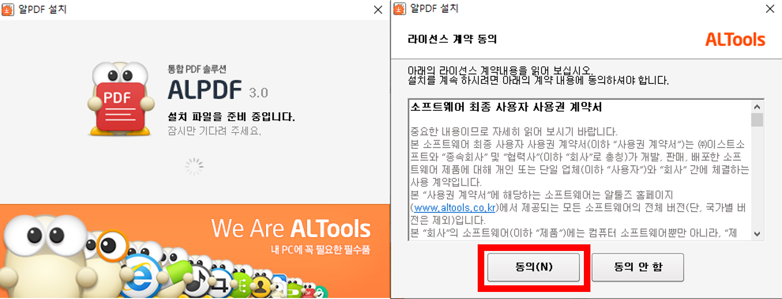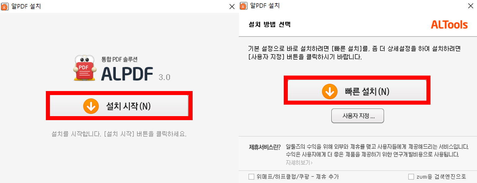 알 PDF를 다운로드하고 설치 프로그램이 실행되면 소프트웨어 최종 사용자 사용권 계약서 내용이 있으며, 동의 버튼을 누르면 설치 시작 버튼이, 다시 설치 시작 버튼을 누르면 빠른 설치 또는 사용자 지정을 선택할 수 있습니다.