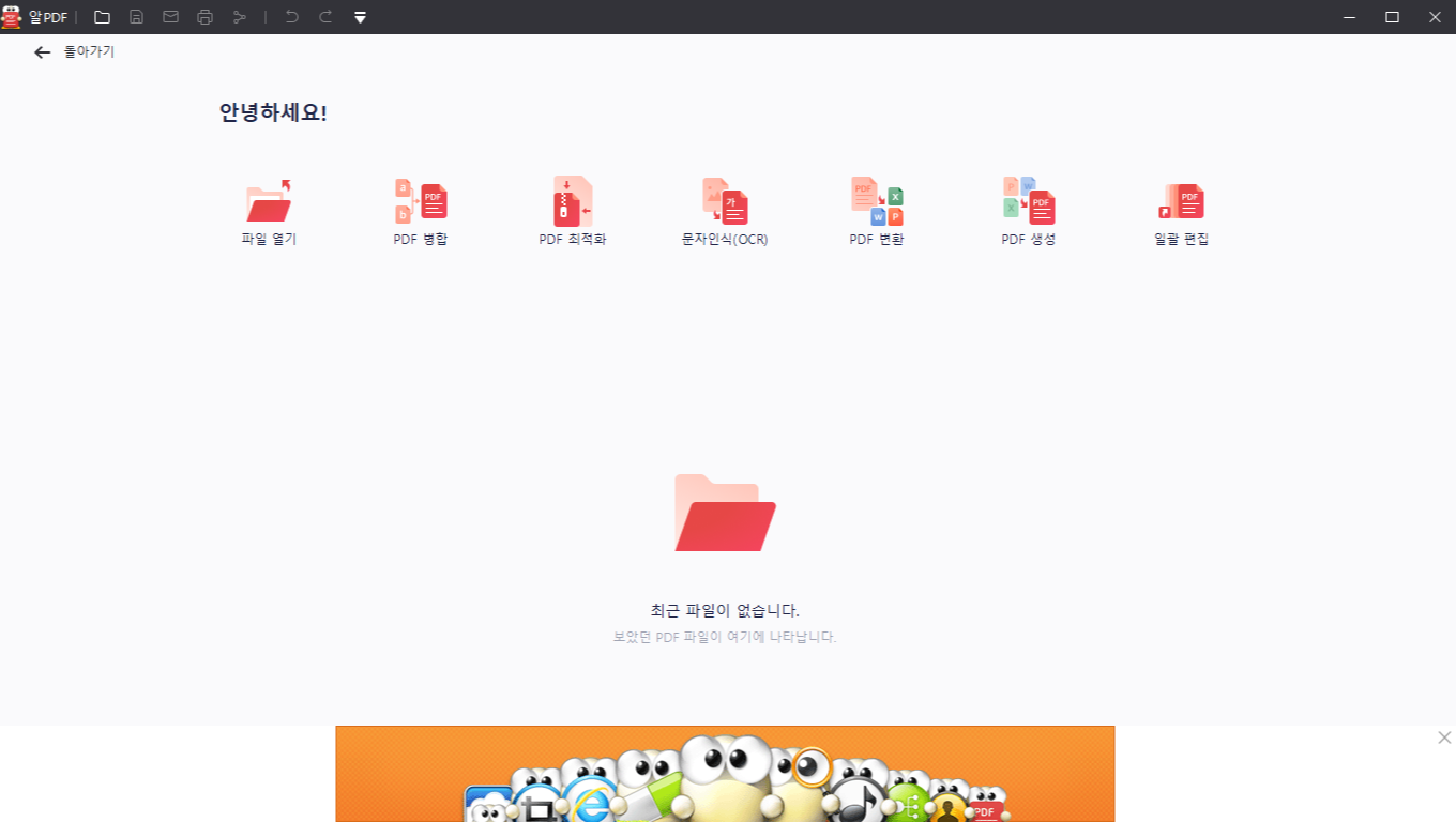 설치가 완료된 화면입니다. 내용을 보면 파일 열기, PDF병합, PDF최적화, 문자인식, PDF변환, PDF 생성, 일괄 편집 등을 수행할 수 있습니다.