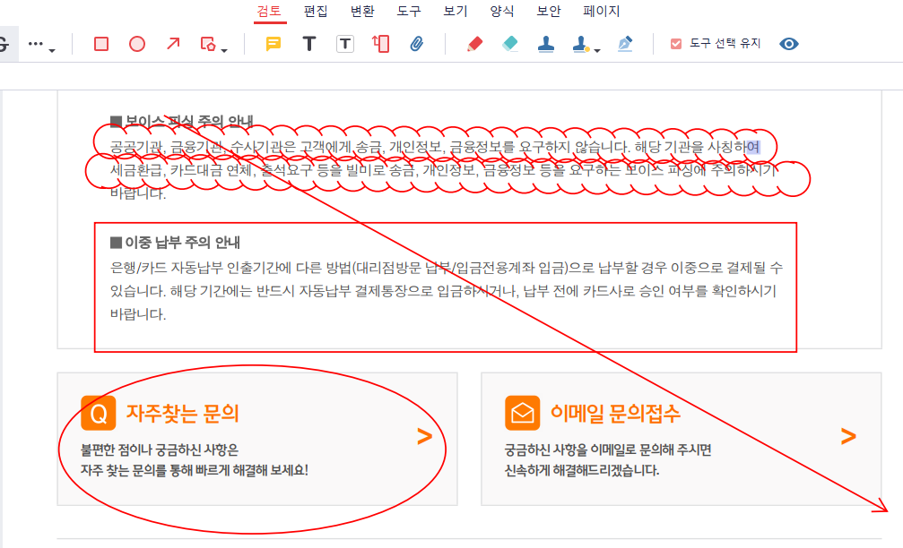 위에 있는 기능을 통해 구름 문자나 사각형, 원, 화살표 등을 수정할 수 있고, 수정 사항을 저장하게 되는 경우 저 상태로 PDF 파일이 저장되어 있습니다.