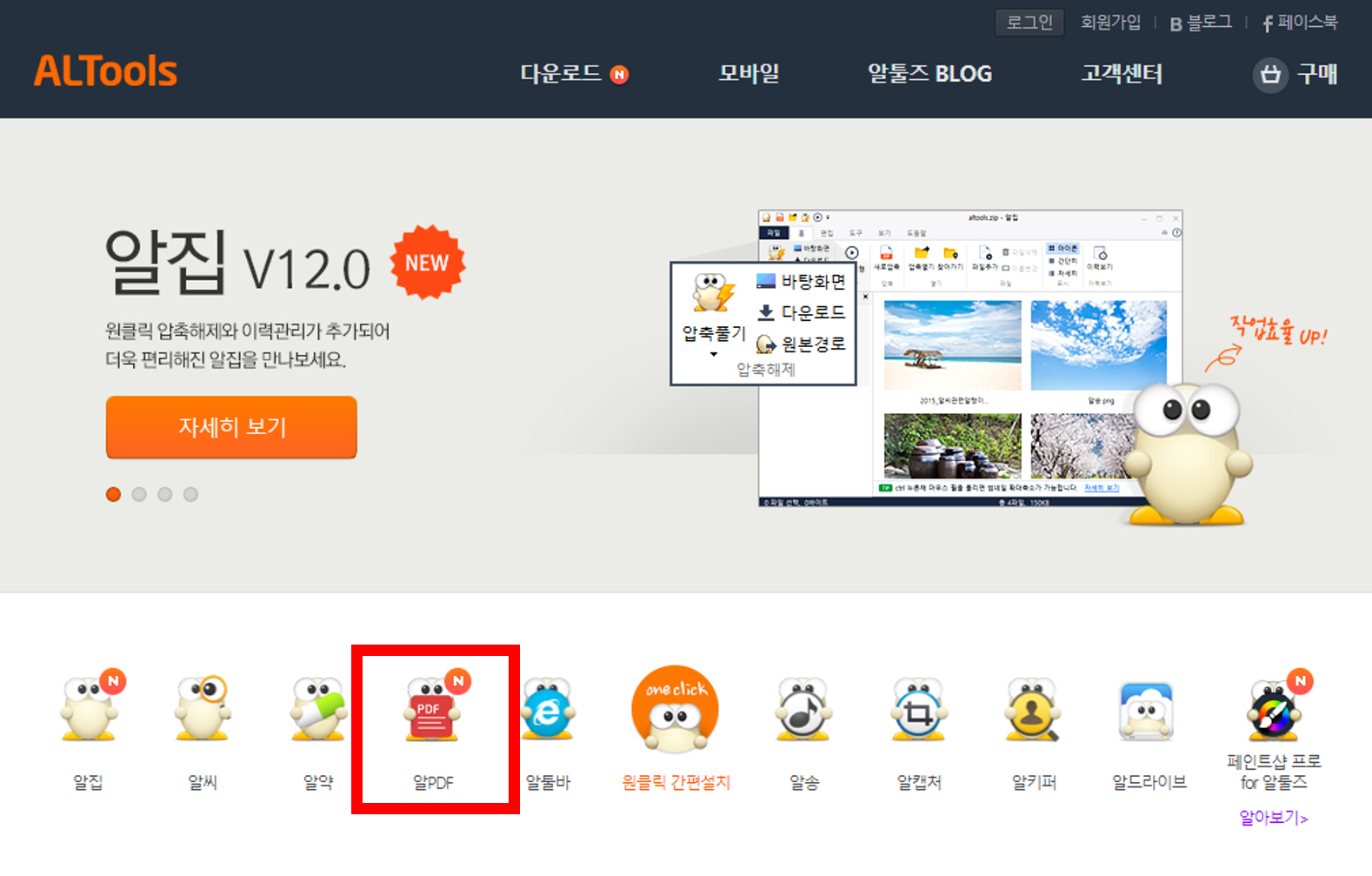 사이트에 들어오게 되면 알집, 알씨, 알약, 알PDF, 알툴바, 알송, 알캡쳐, 알키퍼, 알드라이브 등 다양한 프로그램이 있습니다. 필요한 경우 다른 프로그램을 다운로드하여 사용해도 괜찮습니다.
