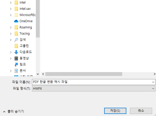 한글파일인 HWP로 변환 버튼을 누르면 위와 같은 창이 뜨며 파일 이름과 파일 형식을 선택하고 저장 버튼을 누르면 되겠습니다.