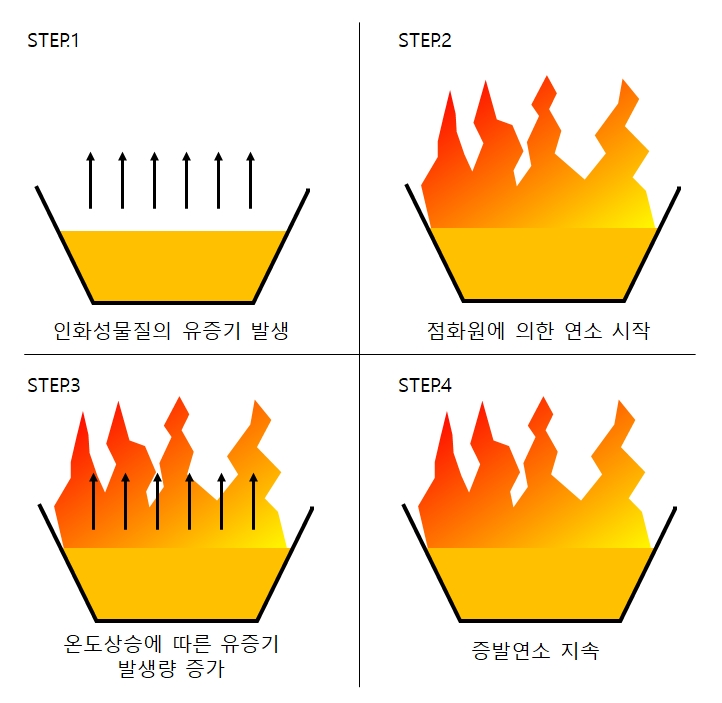 일반적으로 알코올, 가솔린, 등유 등의 인화성액체는 자체 증기압에 의해 증발한다. 이렇게 증발된 증기는 주변 공기와 혼합하며 연소 가능한 분위기를 만들게 되고, 외부의 점화원에 의해 연소가 시작된다. 이를 증발연소(Evaporating Combustion)라고 한다.