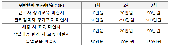 관리감독자 교육의 경우 1차 위반할 경우 50만 원, 2차 위반할 경우 250만 원, 3차 위반할 경우 500만 원으로 점점 더 커지게 되며, 자칫 관리감독자 교육을 이수하지 못한 경우 과태료 부과 대상이 되기 때문에 주의가 필요하겠습니다.