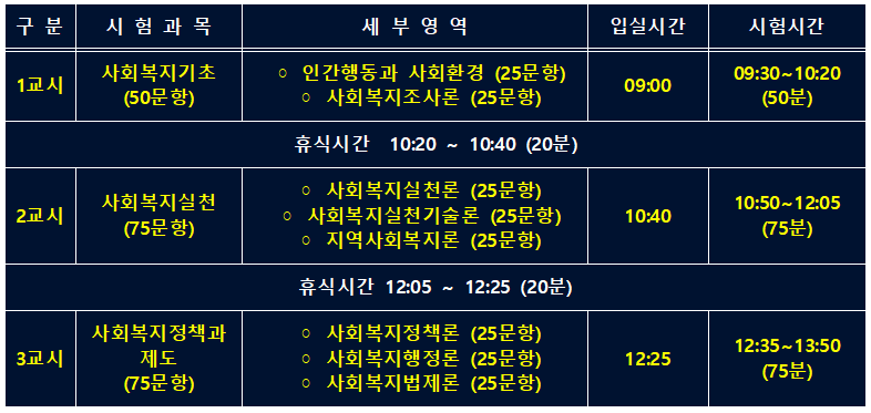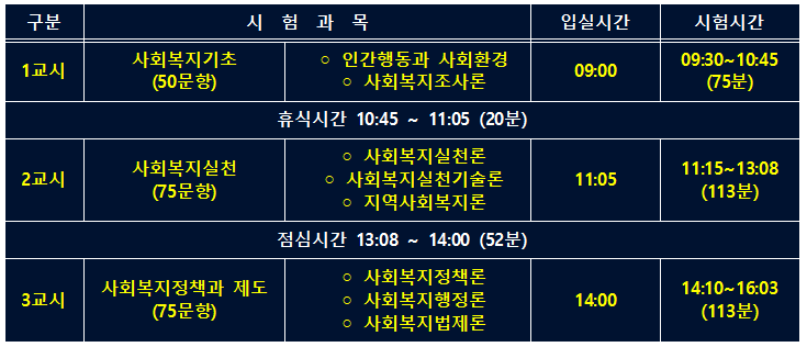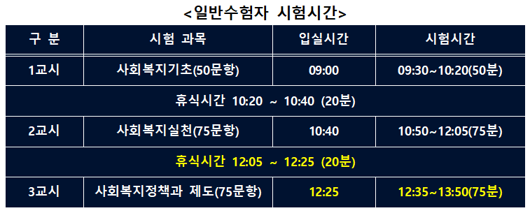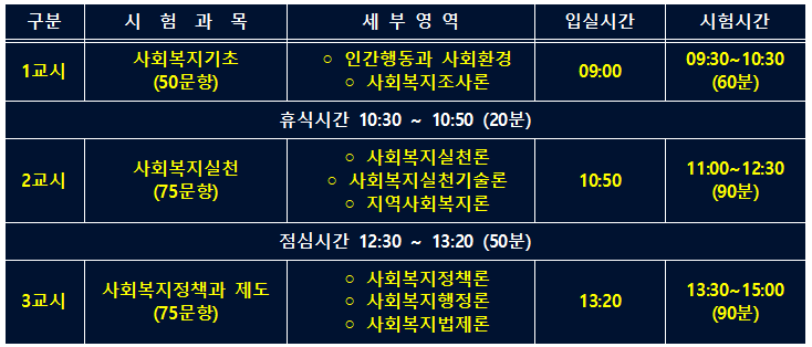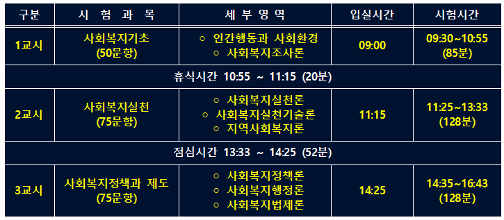 2022년 사회복지사 1급 시험은 코로나19 감염 예방을 위해 점심 시간이 없이 진행될 예정입니다. 따라서 중식 시간 없이 진행되기 때문에 3교시인 사회복지정책과 제도 시험이 12시 25분 부터 시작되는 것으로 변경되었습니다.