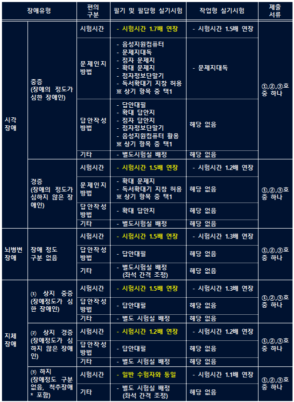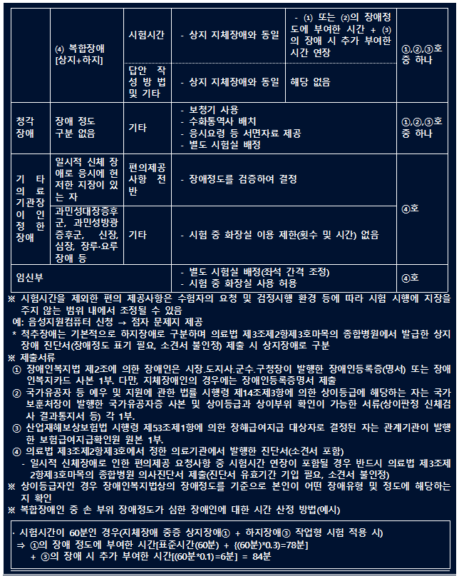 시각장애, 뇌병변장애, 지체장애, 청각장애, 임신부 및 기타의료관장이 인정한 장애의 경우 편의제공받을 수 있습니다. 유형에 따라 시험 시간을 1.2배, 1.5배, 1.7배 까지 연장 가능하며, 별도 시험실 배정 등 편의제공 받을 수 있습니다.