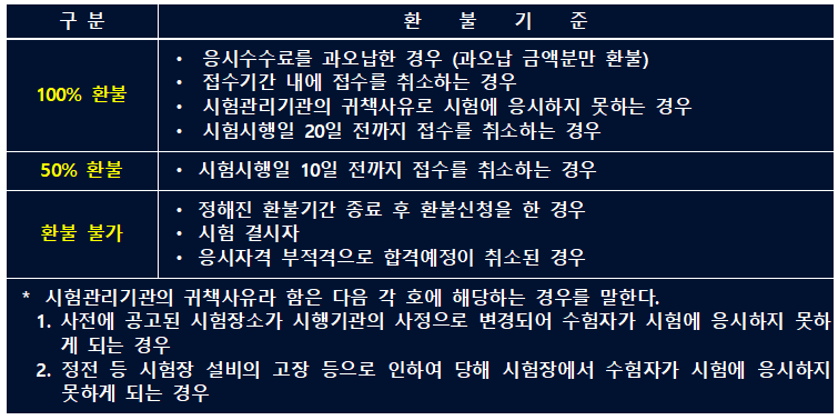 ㆍ 예견할 수 없는 기후상황으로 본인의 거주지에서 시험장까지의 대중교통 수단이 두절되어 시험에 응시하지 못한 수험자가 시험일 이후 30일까지 환불을 신청한 경우 응시수수료의 50% (재난문자, 경찰서 확인서 등 객관적인 증빙자료 첨부)