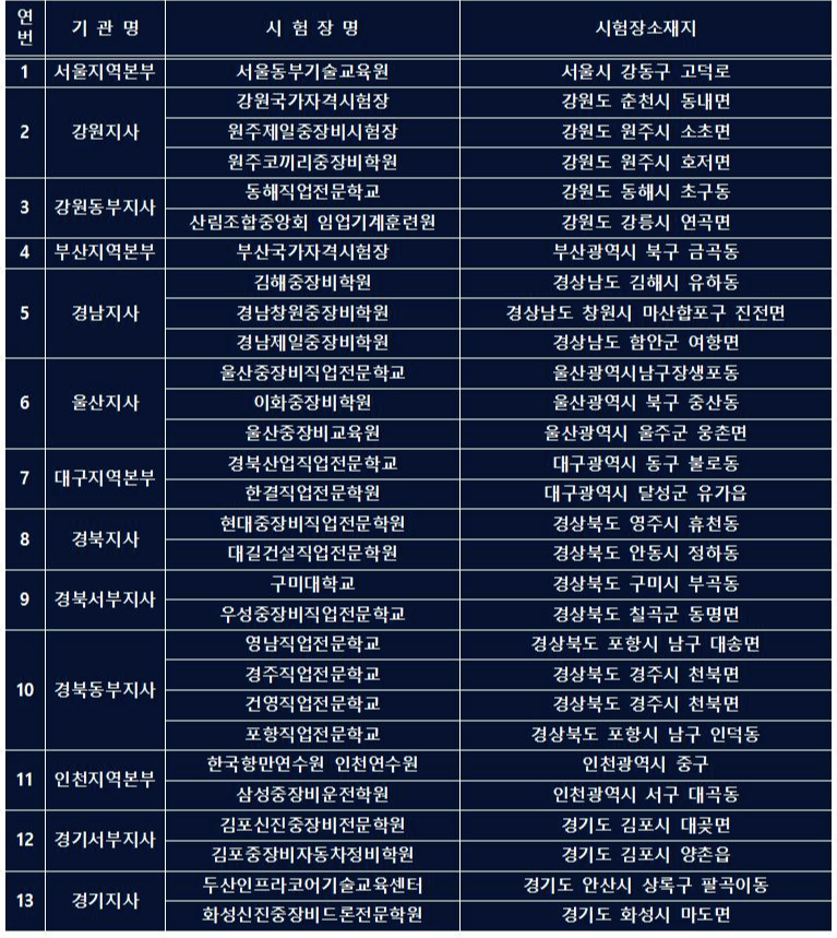 응시하고자 하는 지역에 대해 확인하기 바라며, 각 시험장별 사용하는 장비 기종은 아래 엑셀파일을 통해 확인할 수 있습니다.